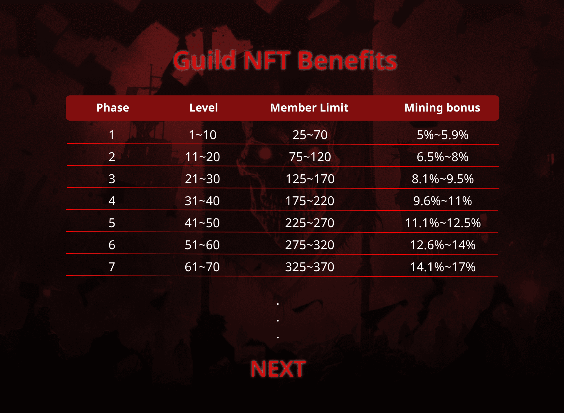 In the VIRUS WORLD ecosystem, NFT holders can participate in guilds. Creating and running a guild using ZVT is open to all. By joining a guild, members receive extra mining power for their NFTs based on the guild's level, and as the guild grows, leaders gain increased mining power. Guilds provide diverse individuals with opportunities to communicate in various spaces and engage in discussions regarding future DAO operations.