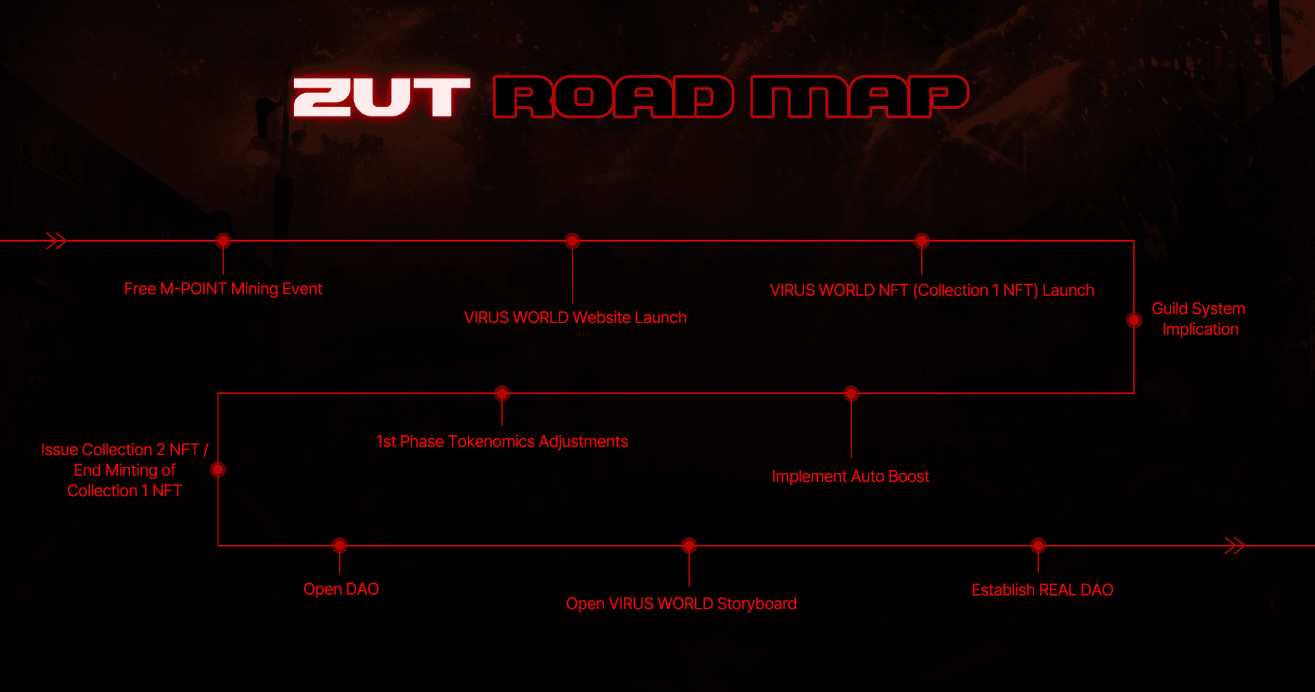 Free M-POINT Mining Event - VIRUS WORLD Website Launch - VIRUS WORLD NFT (Collection 1 NFT) Launch - Guild System Implication - Implement Auto Boost - 1st Phase Tokenomics Adjustments - Issue Collection 2 NFT / End Minting of Collection 1 NFT - Open DAO - Open VIRUS WORLD Storyboard - Establish REAL DAO